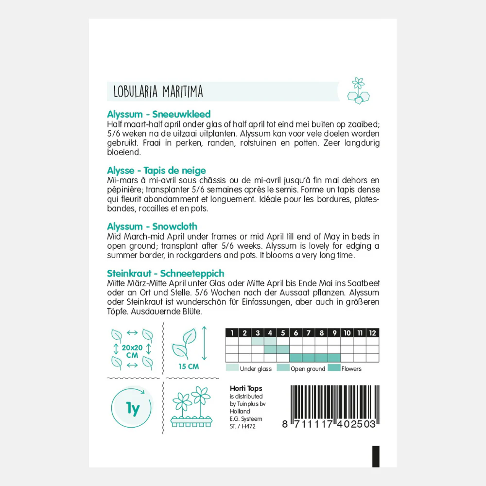 Caractéristiques du produit Magnifique en massif, rocaille et pot Entièrement recouvert de fleurs blanches Parfois ils fleurissent une seconde fois Emplacement Semer en pleine terre Oui Lumière de localisation Soleil Hauteur 15 cm Taper Annuel Périodes Temps de semis à l’intérieur Mars Temps de semis à l’intérieur jusqu’à Avril Temps de semis à l’extérieur de […]