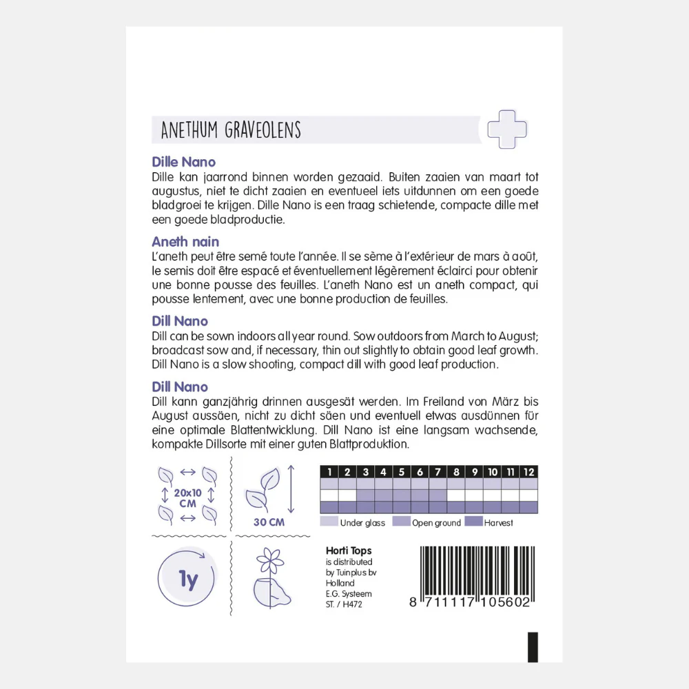 L’aneth peut être semé à l’intérieur toute l’année. Semez en extérieur de mars à août, ne semez pas trop densément et, si nécessaire, éclaircissez légèrement pour assurer une bonne croissance des feuilles. L’aneth Nano est un aneth compact à pousse lente avec une bonne production de feuilles.