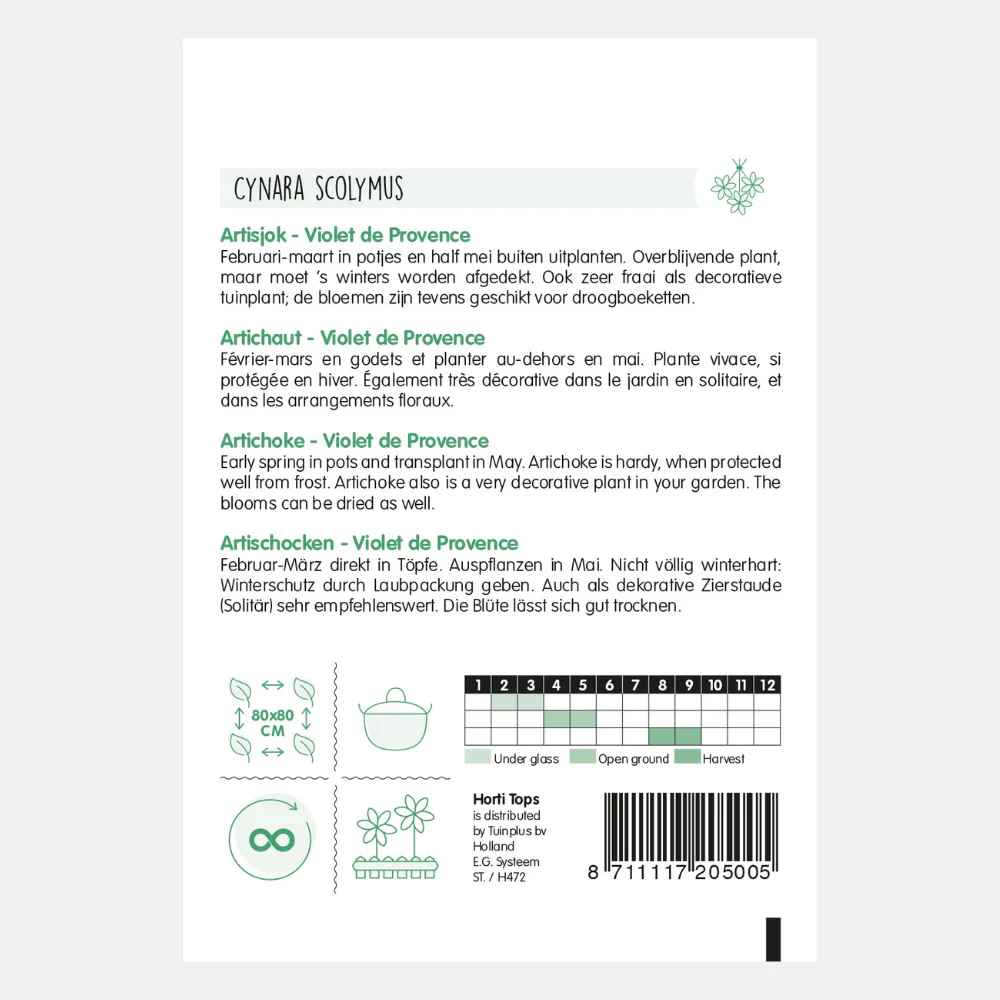 Belle fleur ou délicieux assaisonnement. Artichaut Violette de Provence. Semez en pot de février à mars puis plantez en extérieur à la mi-mai. L’artichaut est une plante vivace, mais doit être couverte en hiver. Également très belle comme plante de jardin décorative ; les fleurs conviennent également aux bouquets séchés.