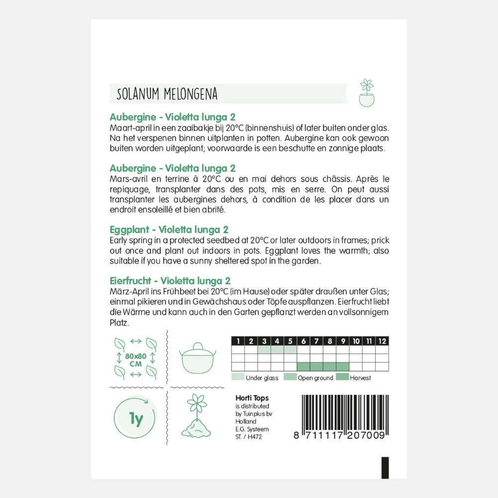 Délicieuse aubergine ! aubergine – Longue Violette. De mars à avril en pot de culture à 20°C (en intérieur) ou plus tard à l’extérieur sous verre. Après le repiquage, plantez en pot à l’intérieur. l’aubergine peut également être plantée à l’extérieur ; La condition est un endroit abrité et ensoleillé.