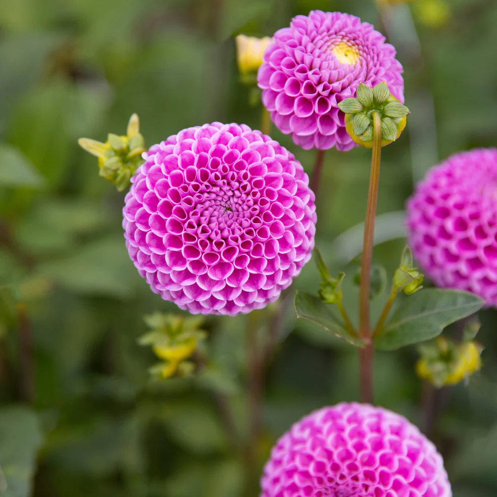 Le dahlia ‘Franz Kafka’ est un dahlia compact en forme de boule, aux fleurs sphériques d’une régularité parfaite. Ses pétales d’un rose éclatant s’emboîtent harmonieusement, conférant à la fleur une allure presque géométrique.