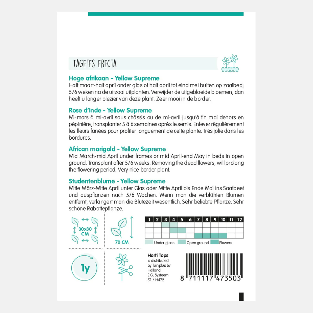 Emplacement Hauteur 70 cm Taper Annuel Périodes Temps de semis à l’intérieur Mars Temps de semis à l’intérieur jusqu’à Avril Temps de semis à l’extérieur de Avril Temps de semis à l’extérieur jusqu’à mai Période de floraison de Juillet Période de floraison jusqu’à Octobre Caractéristiques des semences Graines par gramme 300