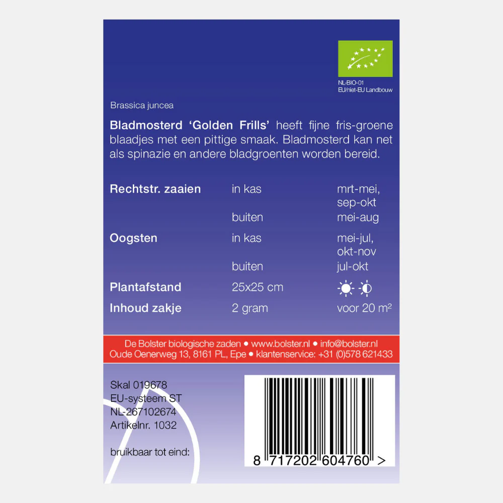 ‘Golden Frills’ est une moutarde en feuilles au goût épicé. Les feuilles vertes sont préparées de la même manière que les autres légumes à feuilles et les épinards. ‘Golden Frills’ convient à la culture des babyleafs. Un sac fait environ 2 m2 et la distance de plantation est de 15 x 2 cm.