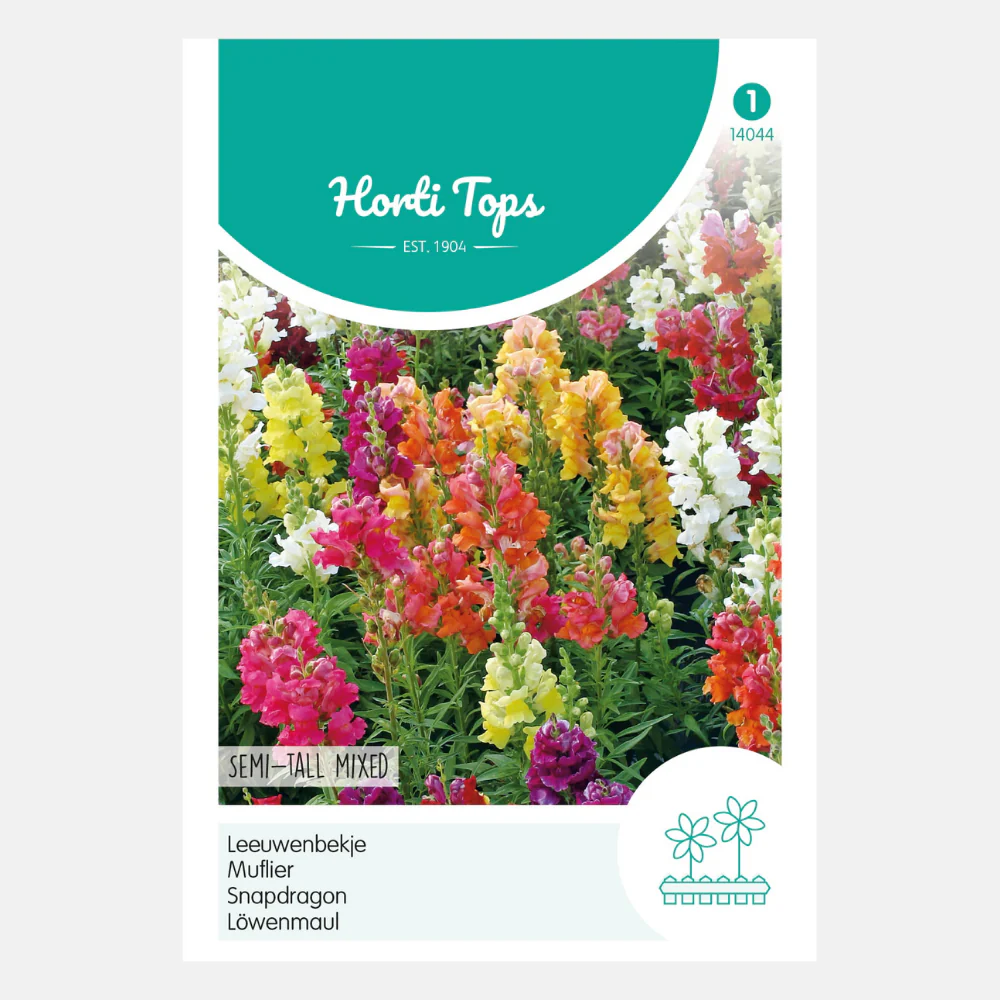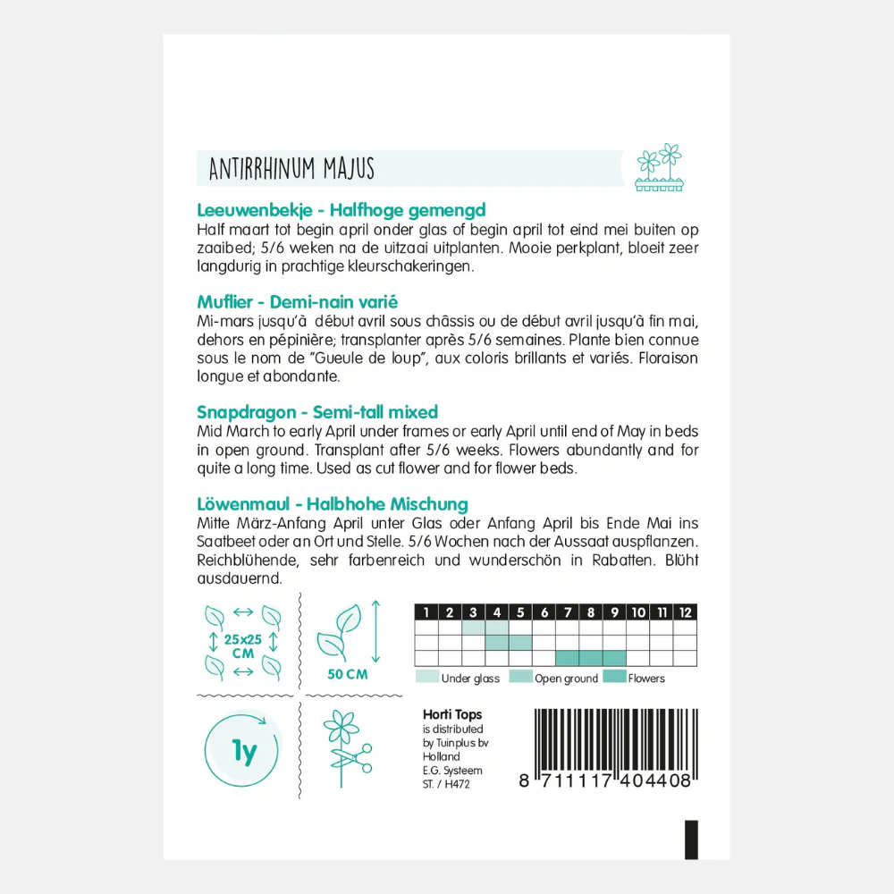 Hauteur : 50 cm. Fleurs au potager, idéales pour attirer les insectes utiles et en plus elles sont belles. Muflier. Peut être semé sous serre de mi-mars à mi-avril ou en extérieur en pépinière de mi-avril à fin mai. Plantez en bordure après environ 5 à 6 semaines. Ce mélange atteint une hauteur d’environ 50 cm et fleurit jusqu’au début de l’automne.