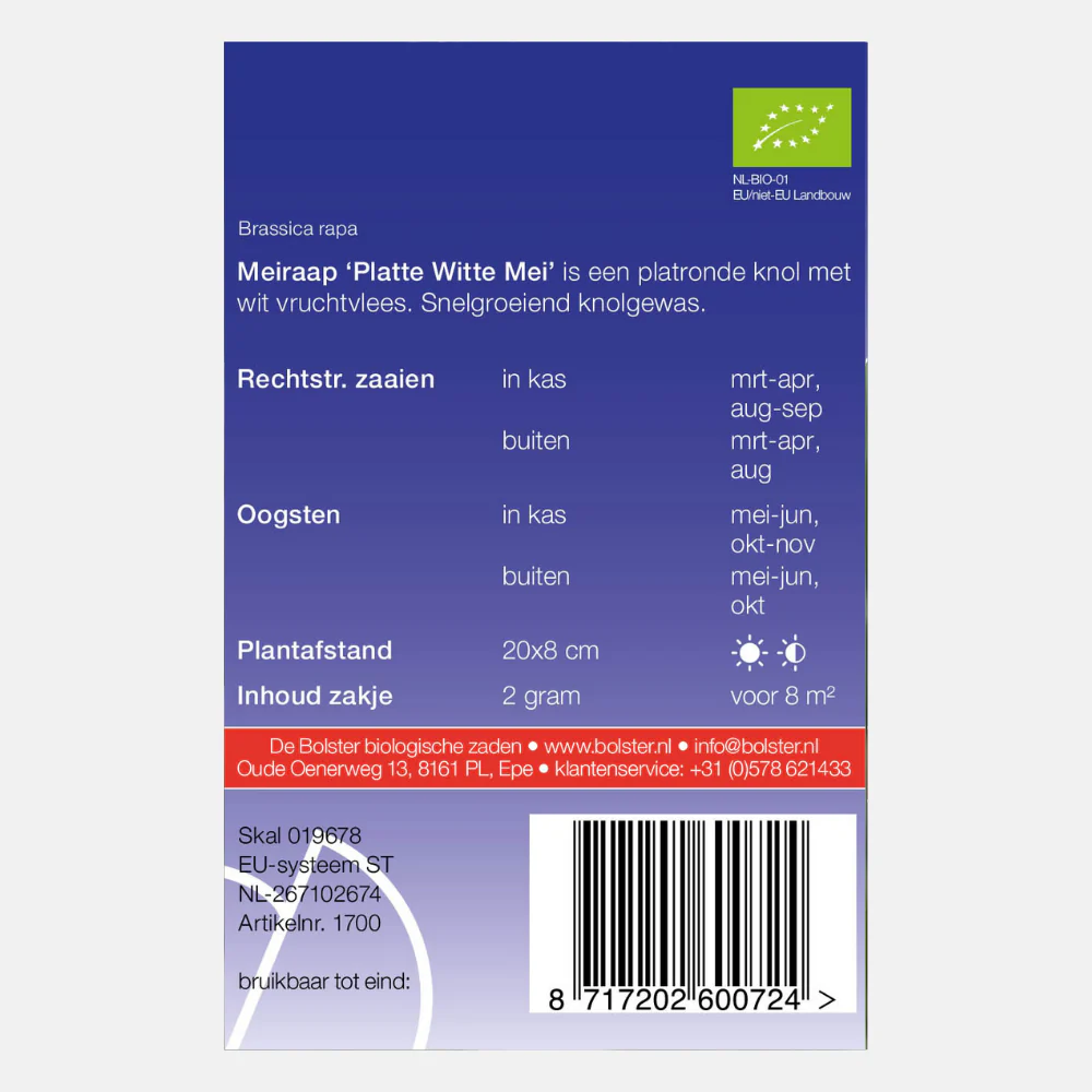 Le navet ‘Platte Witte Mei’ est un légume racine à croissance rapide et ne nécessite pas d’engrais. Le tubercule plat et rond a une chair blanche et était autrefois une source nutritionnelle importante. Un sac fait environ 8 m2 et la distance de plantation est de 20×8 cm.