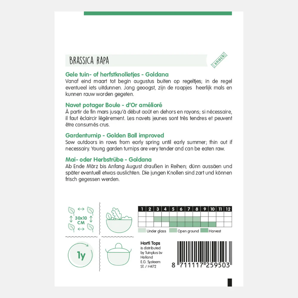 De fin mars à début août, extérieur régulièrement ; En règle générale, éclaircissez légèrement si nécessaire. Récoltés jeunes, les navets sont merveilleusement tendres et peuvent être consommés crus.
