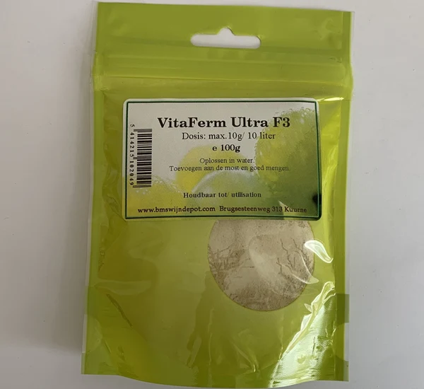 Utilisation : ajouter progressivement 2 x 30-40 grammes pour 100 litres (légalement autorisé (UE) max. 100 grammes pour 100 litres). Mélangez VitaFerm® Ultra F3 dans du moût ou de l’eau et ajoutez-le au moût.