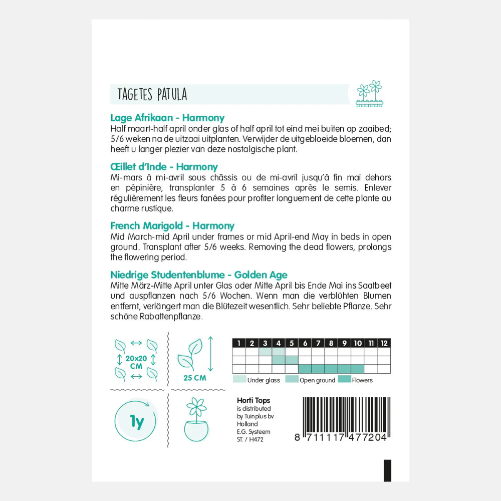 Soucis Petite Harmonie. Semer sous serre de mi-mars à mi-avril ou en extérieur en pépinière de mi-avril à fin mai ; Plantez 5 à 6 semaines après le semis. Retirez les fleurs fanées pour pouvoir profiter plus longtemps de cette plante nostalgique.
