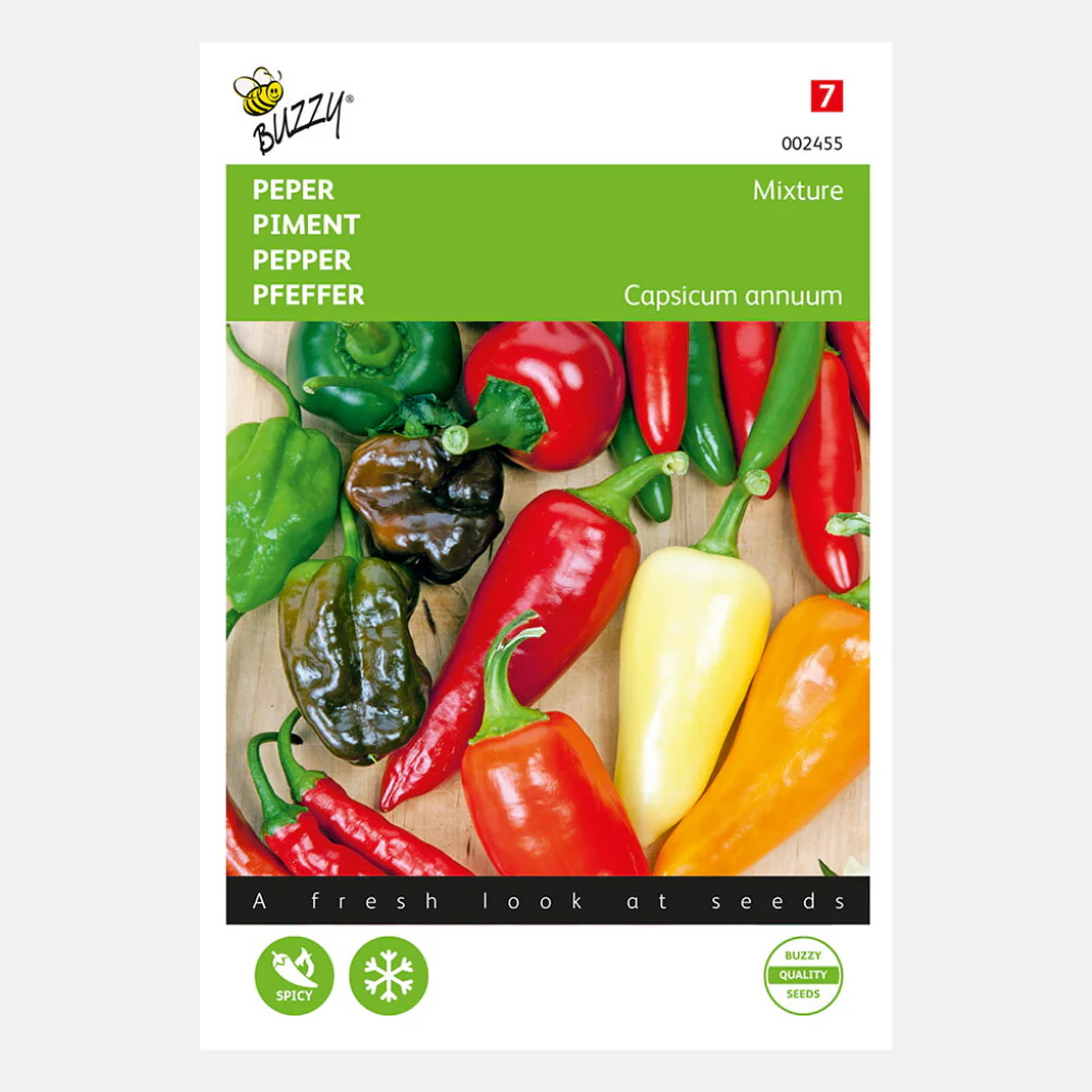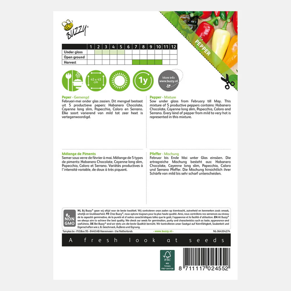 Semer de février à mai sous serre. Mélange de 5 types de piments : chocolat Habanero, piments Cayenne rouge, Papecchia, Caloro et Serrano. Variétés productives dont la force varie de douce à très piquante.