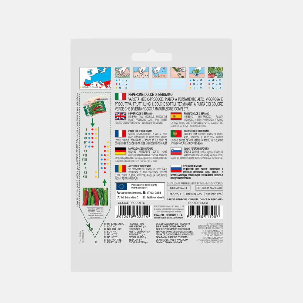 Cette plante produit des poivrons verts longs, fins, doux et pointus. Ils deviennent lentement rouges. Semis : février à mai Récolte : juillet à octobre