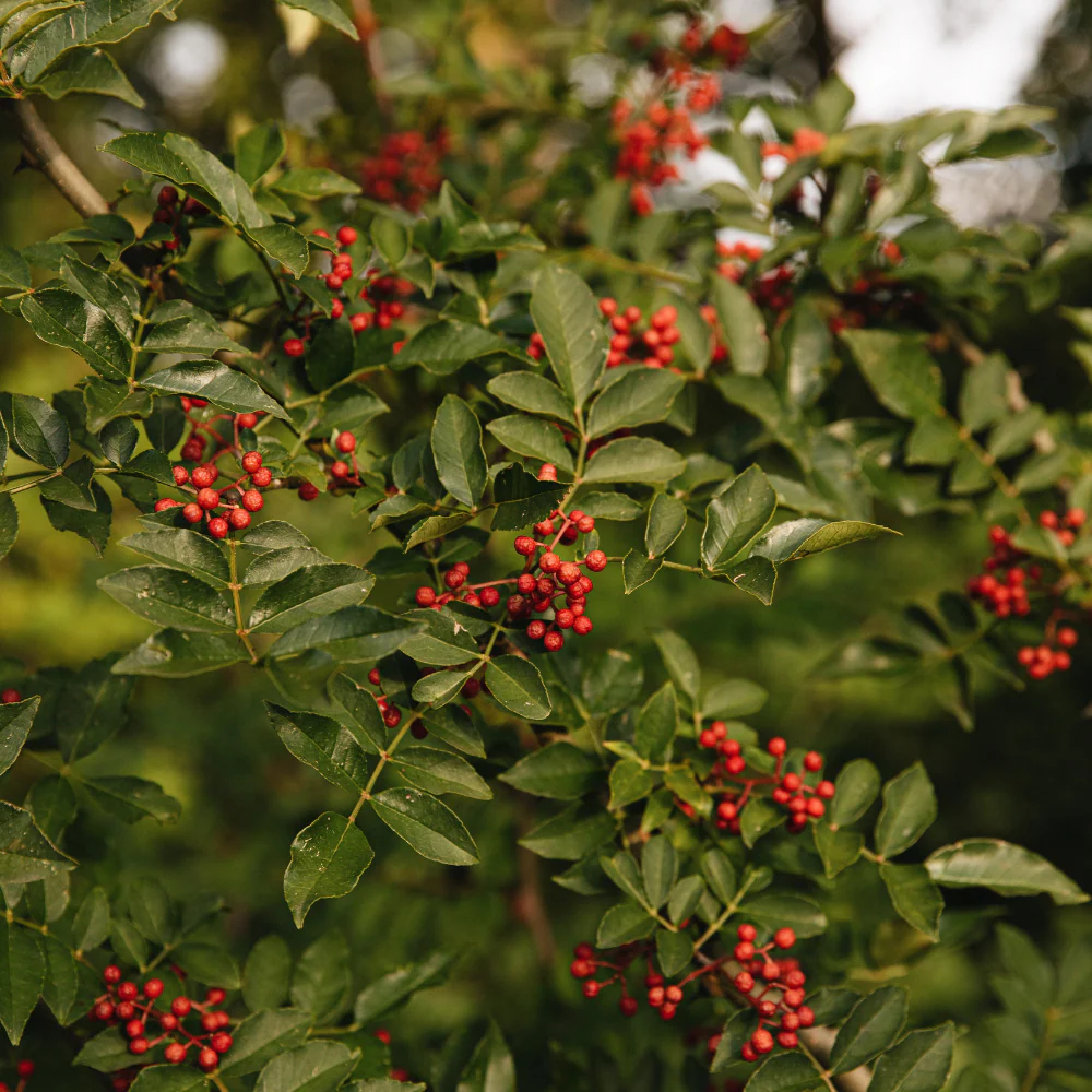 Fruits : Après la floraison, la plante produit des gousses de graines rouges et poivrées qui s’ouvrent pour révéler des graines noires brillantes. Les cosses de ces gousses de graines sont utilisées comme épice bien connue du poivre du Sichuan, connue pour son arôme d’agrumes et son léger picotement sur la langue.