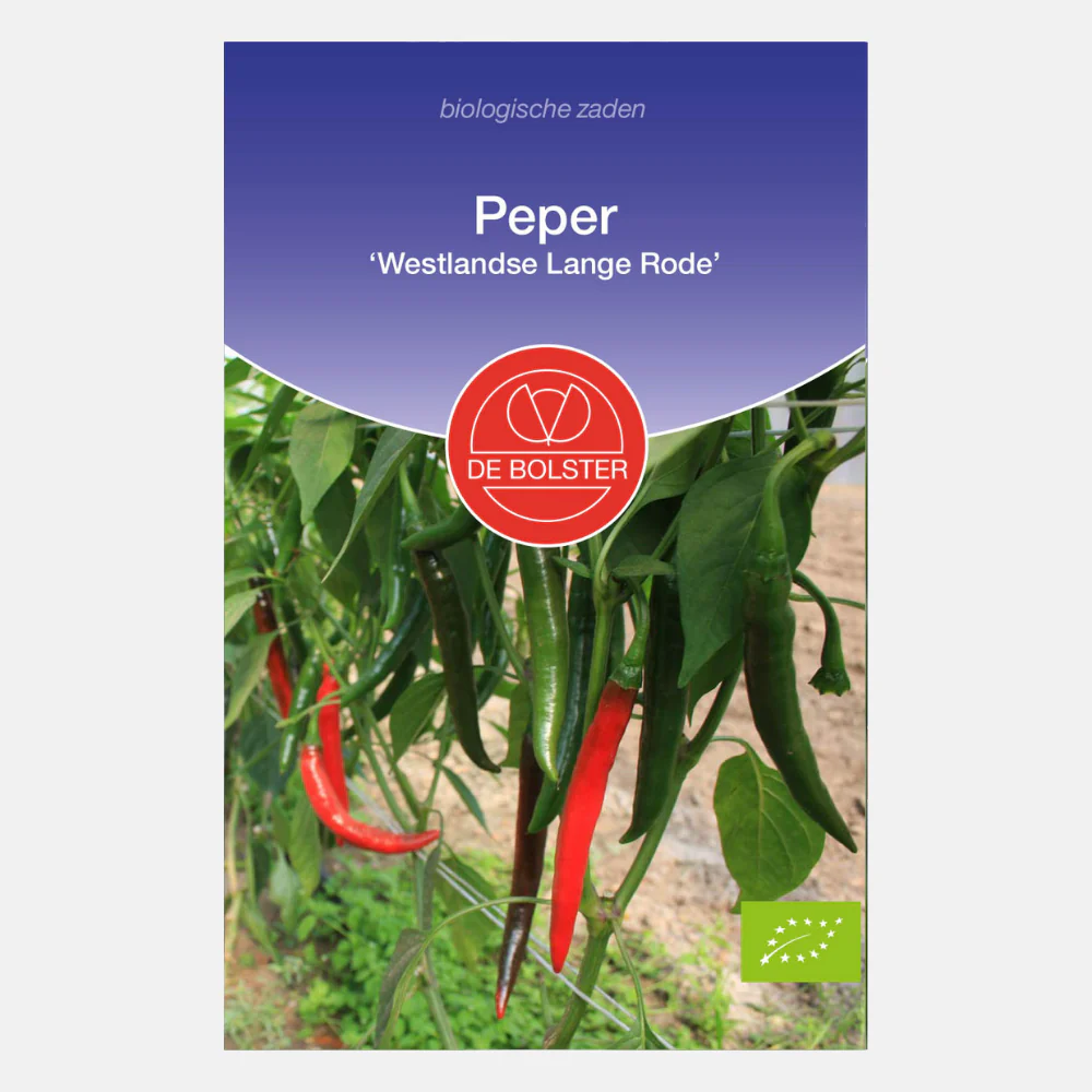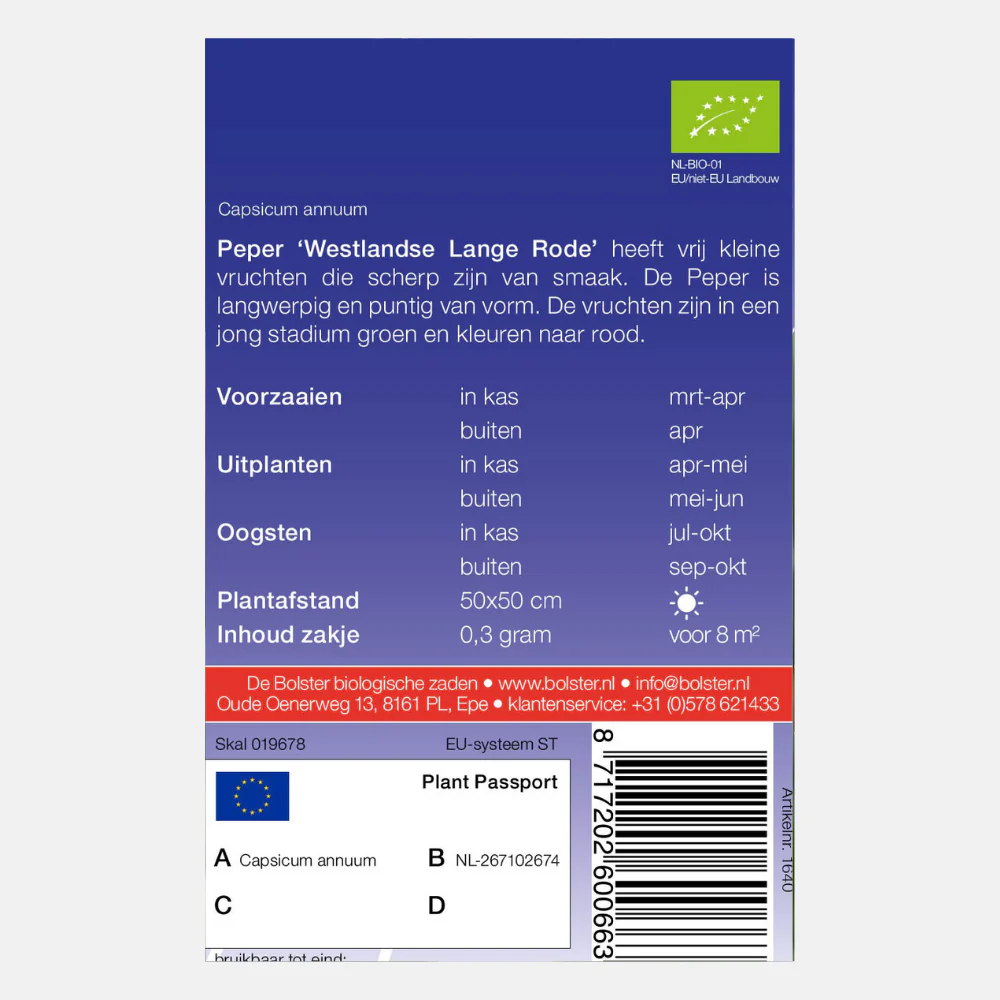 Le poivre ‘Westlandse Lange Rode’ produit des fruits pointus et allongés. Ils sont encore verts lorsqu’ils sont jeunes et deviennent rouges en mûrissant. Les petits fruits ont un goût piquant. Un sac fait environ 8 m2 et la distance de plantation est de 50 x 50 cm.