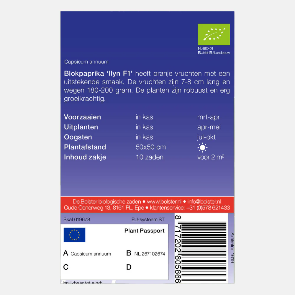Les fruits orange du poivron ‘Ilyn F1’ mesurent 7 à 8 cm de long et pèsent 180 à 200 grammes. Les plantes sont très vigoureuses et robustes et produisent des fruits d’un excellent goût. Un sac fait environ 2 m2 et la distance de plantation est de 50×50 cm.